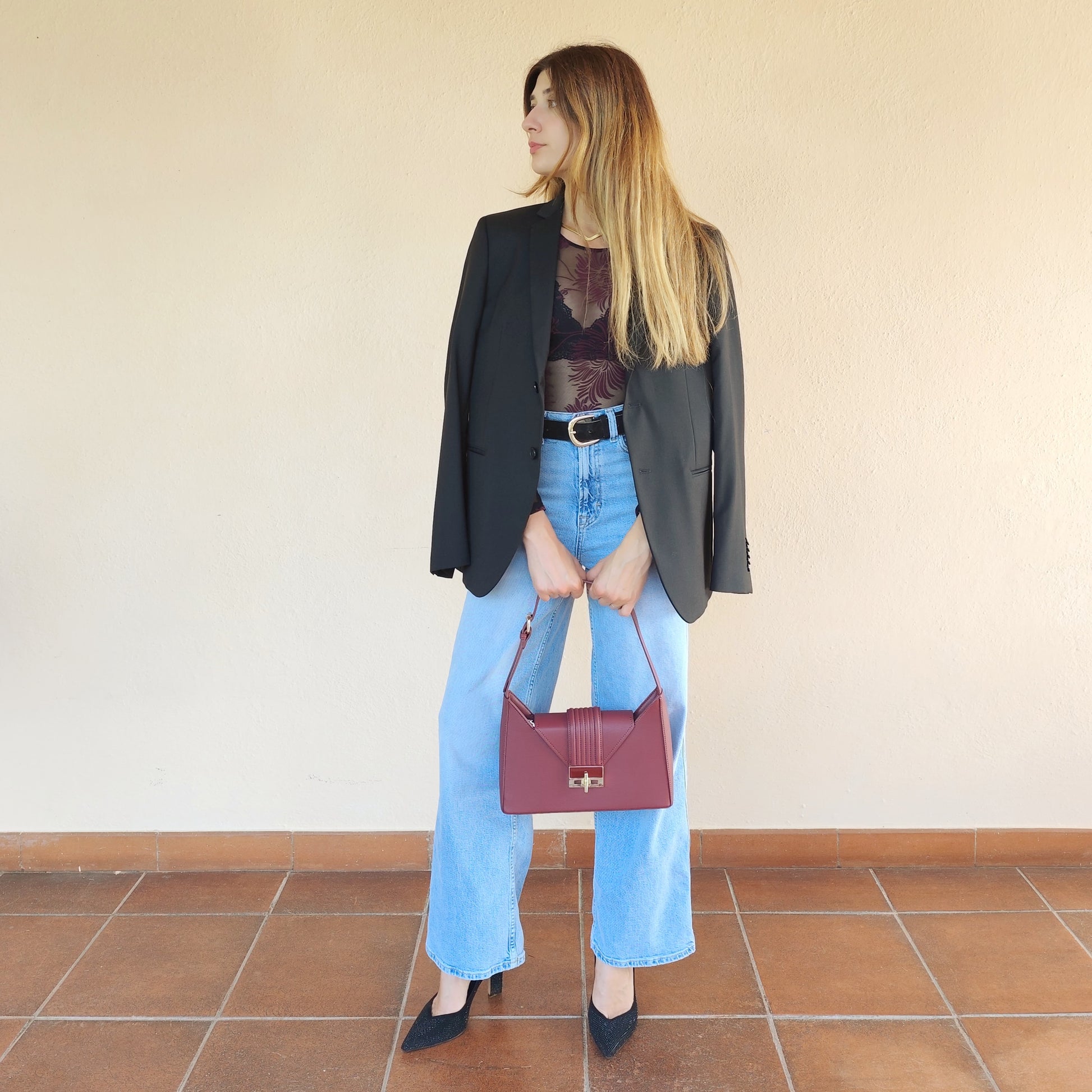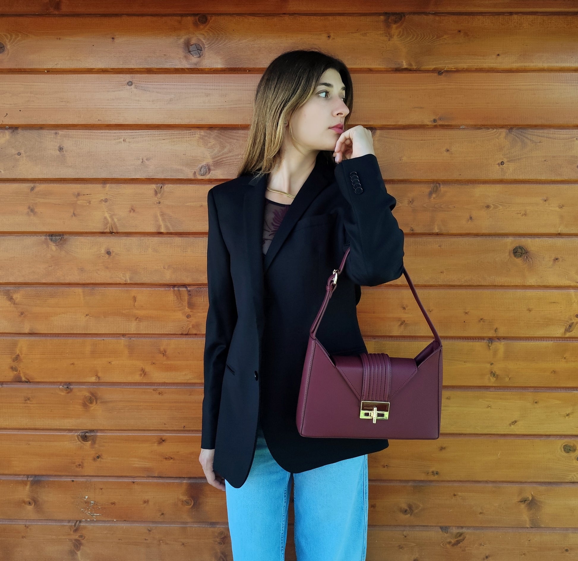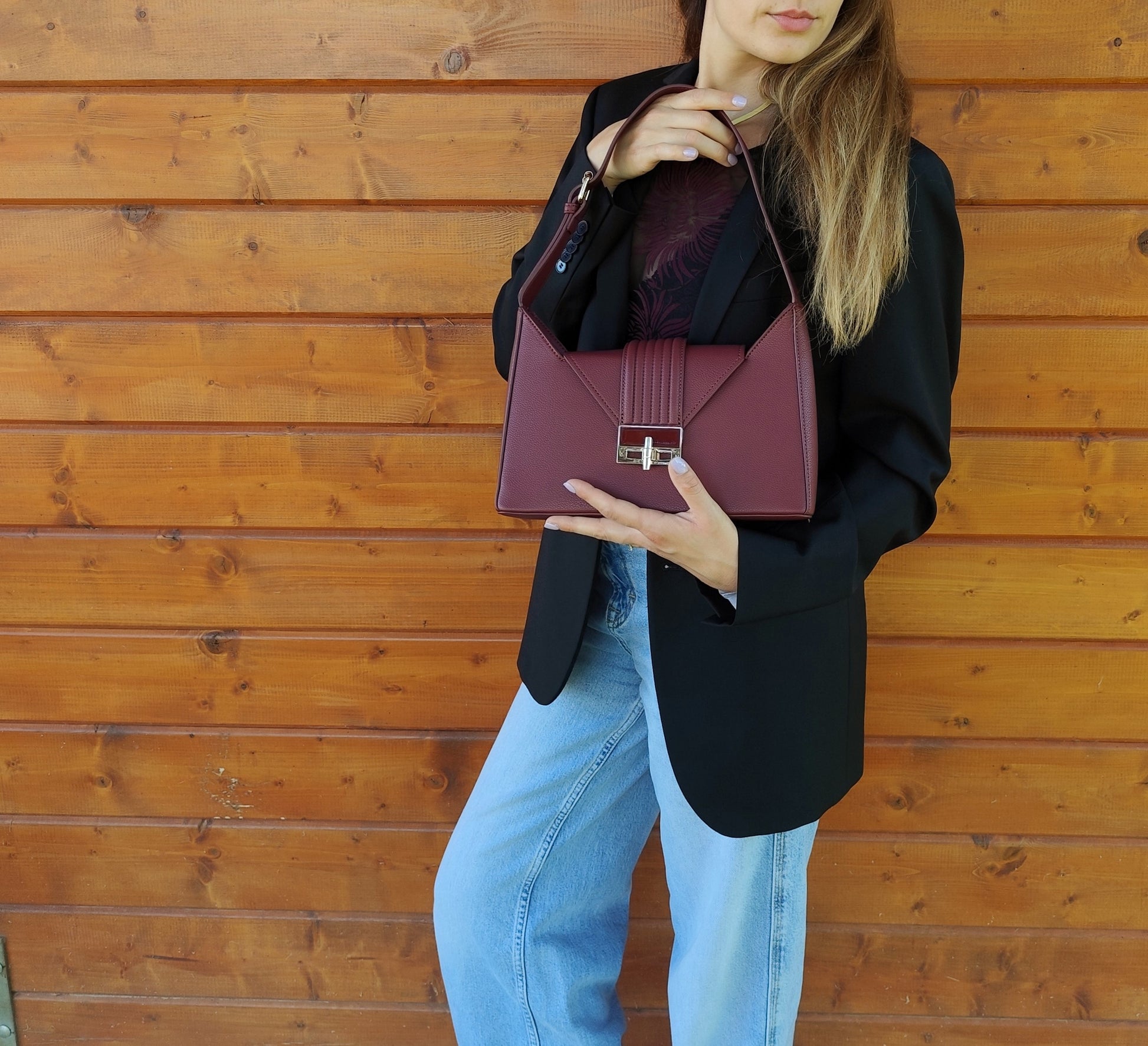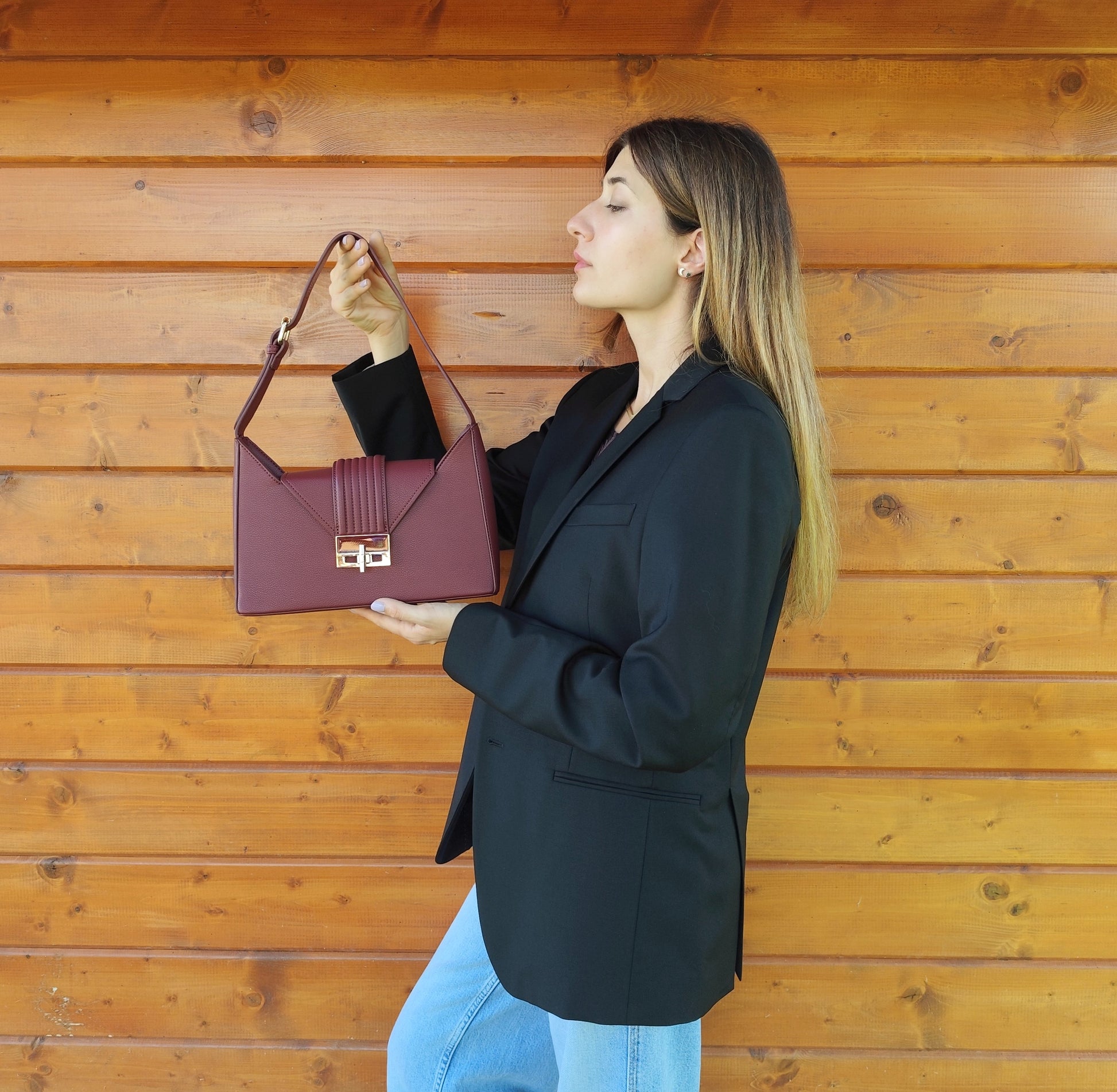 La borsa a spalla Ambra combina un audace design geometrico con calde tonalità autunnali in similpelle, per uno stile deciso e raffinato. La chiusura a lettera con gancio dorato aggiunge un tocco prezioso, mentre la tracolla estendibile garantisce versatilità e comfort in ogni occasione. Internamente, la zip di sicurezza e le due tasche, di cui una con chiusura, offrono spazio organizzato senza rinunciare all’eleganza minimalista. Perfetta per chi osa distinguersi senza compromessi.