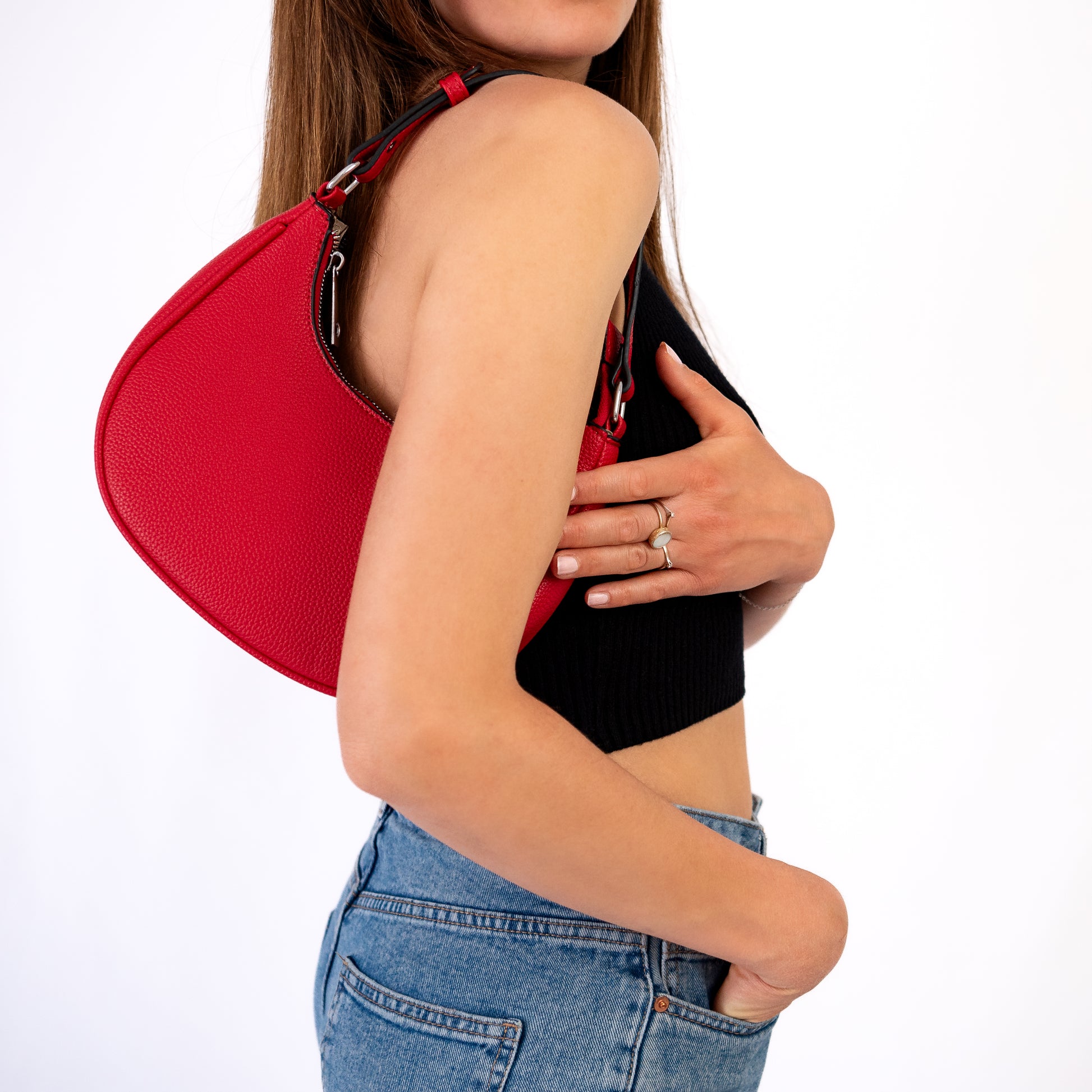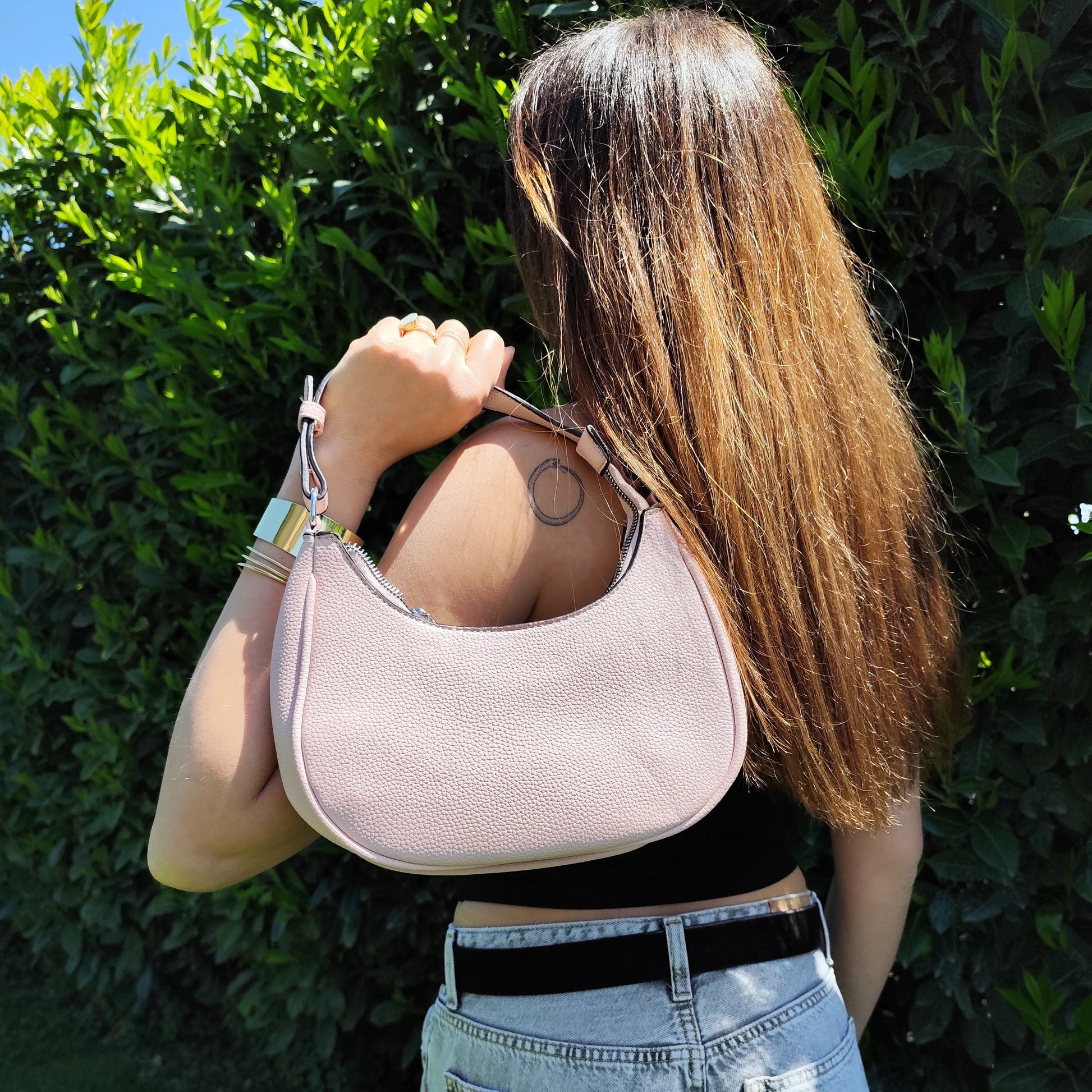 La borsa a spalla Midnight è un elegante accessorio in similpelle a mezzaluna, con comoda chiusura a cerniera e manico regolabile per un uso versatile a mano o in spalla. Foderata con due tasche, di cui una con cerniera, dotata di tracolla ricamata regolabile e tasca esterna aggiuntiva con zip. Adatta ad ogni occasione.