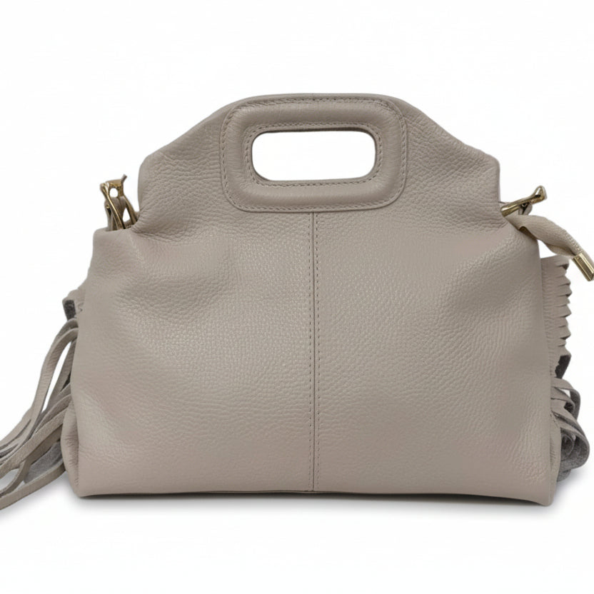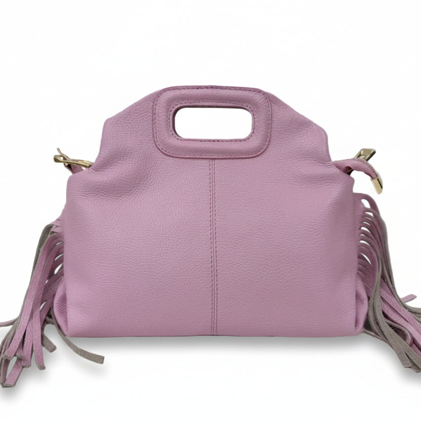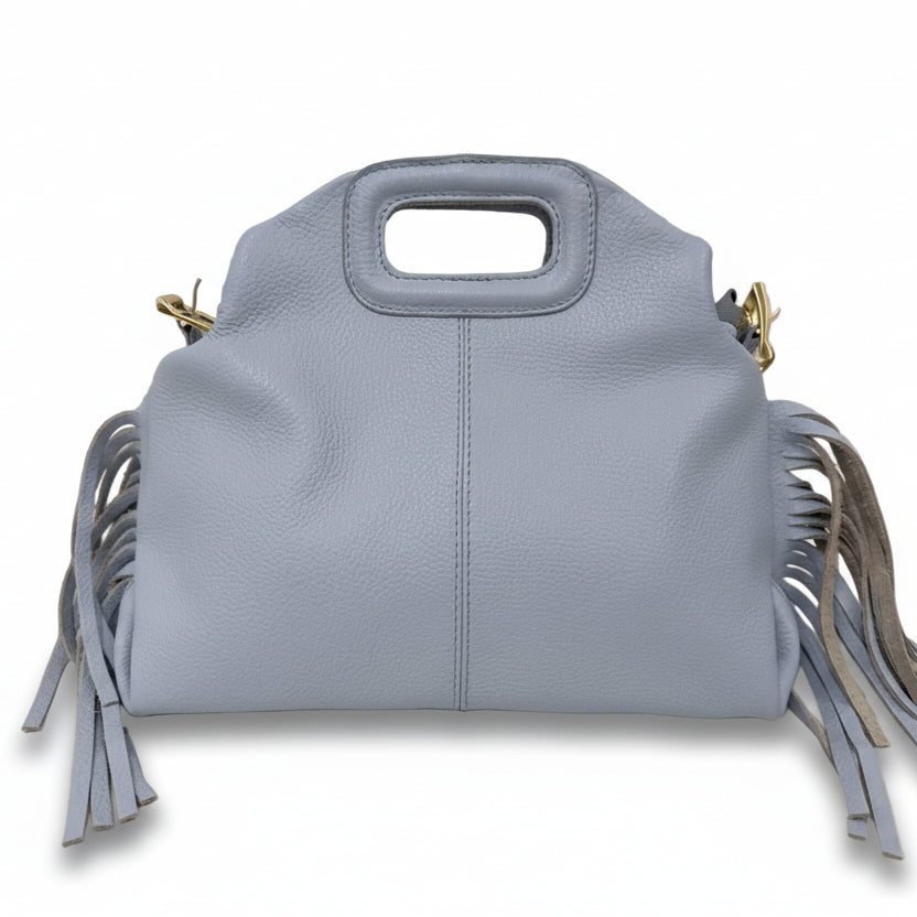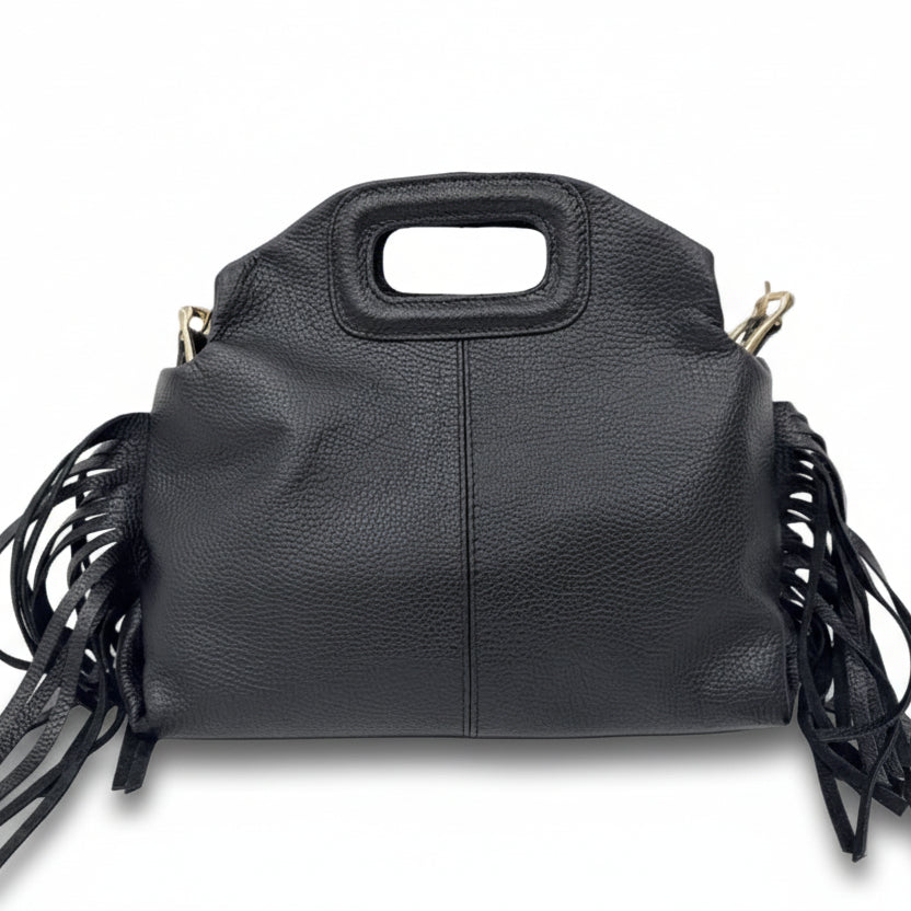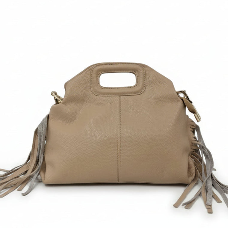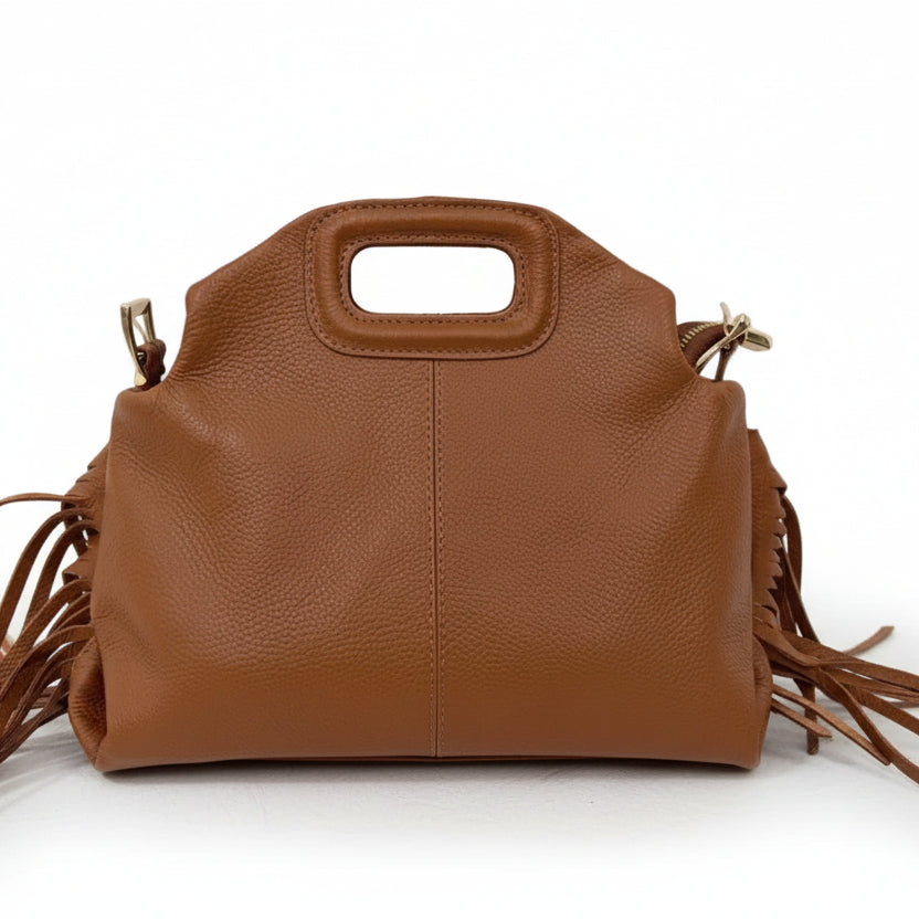 Le frange donano movimento e personalità, rendendola perfetta per chi ama distinguersi con un tocco boho-chic ma sempre raffinato. La lavorazione artigianale esalta la bellezza naturale della pelle, rendendo ogni pezzo unico.