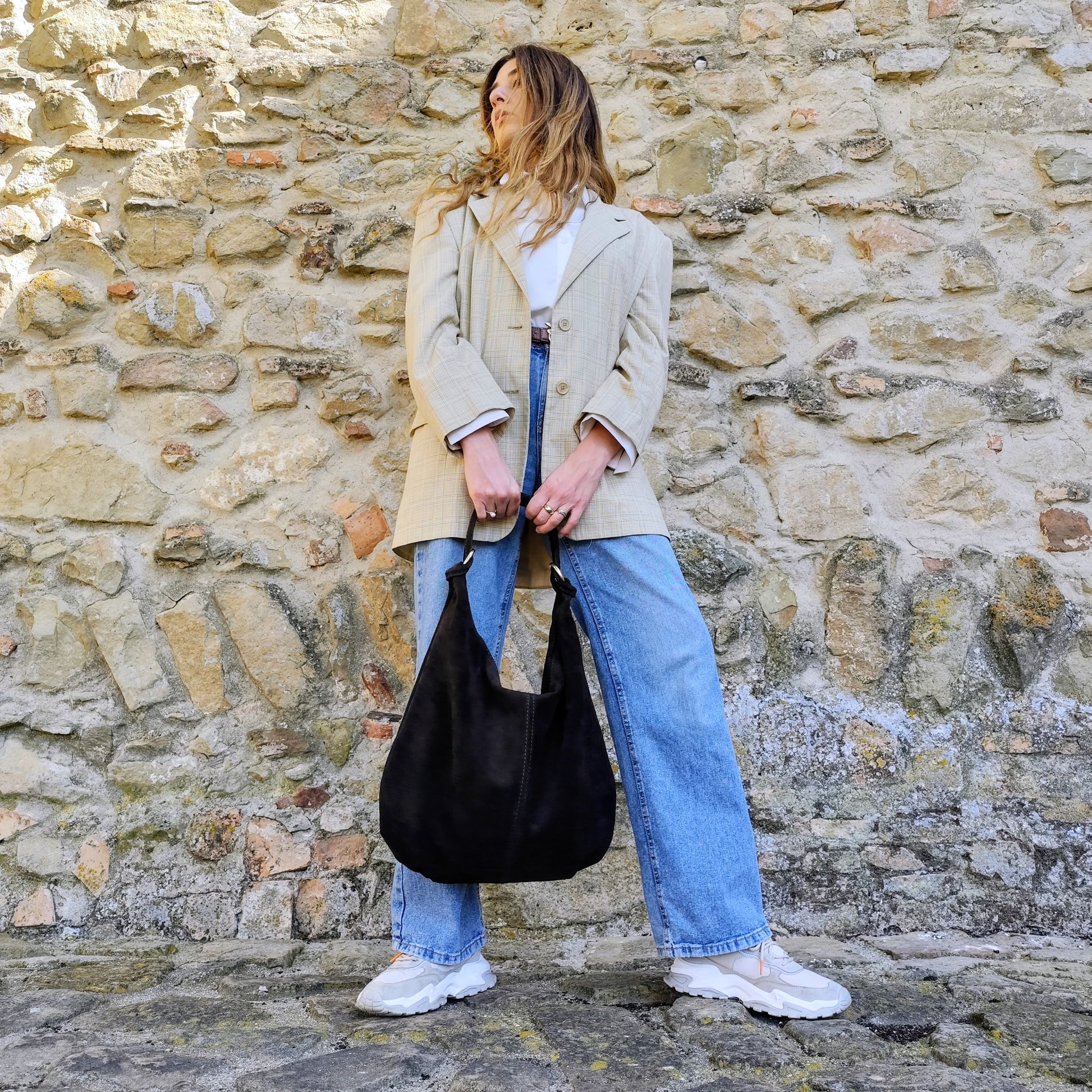 La borsa a spalla Tierra in morbido suede unisce stile e versatilità. La sua forma hobo elegante permette di indossarla comodamente a spalla, a tracolla o a mano ripiegata. Interno foderato e con taschino, Disponibile nelle tonalità più cool dell’autunno, aggiunge un tocco di classe e si adatta a ogni look quotidiano con facilità. Scopri il piacere di un accessorio che saprà valorizzare ogni tuo outfit.