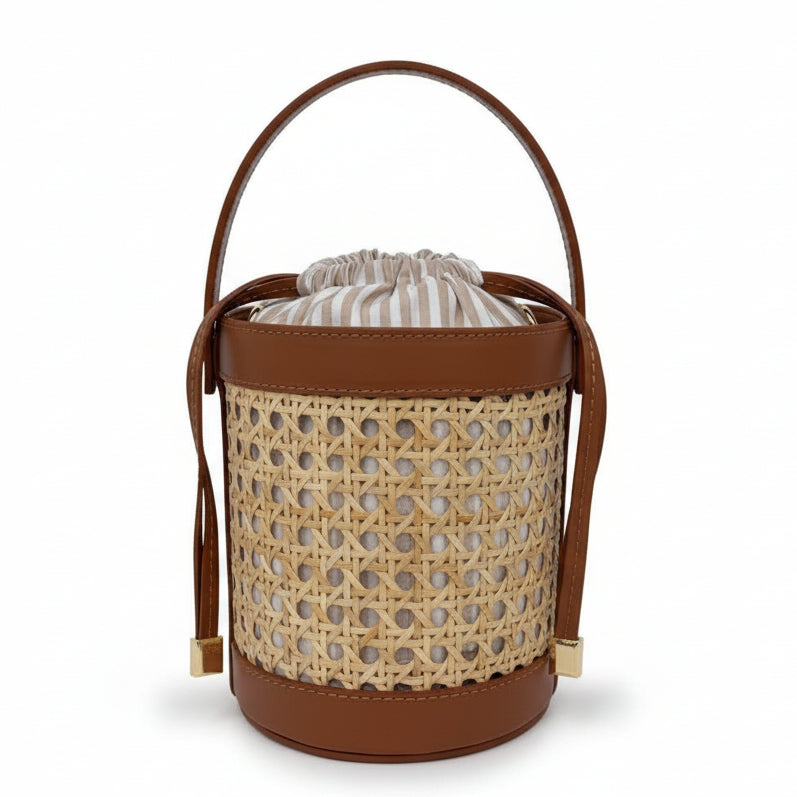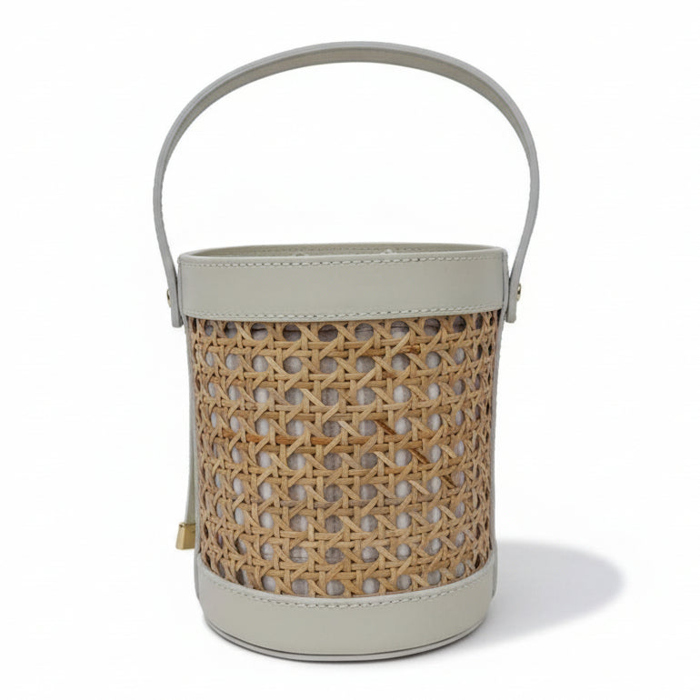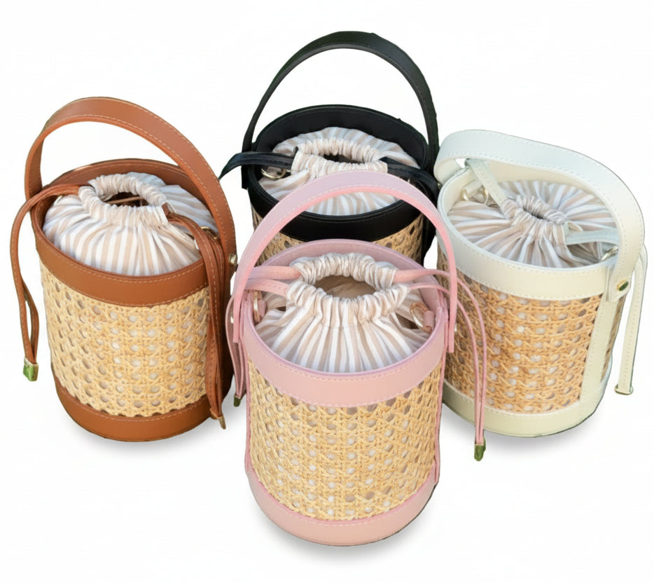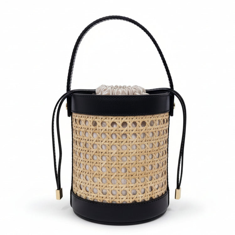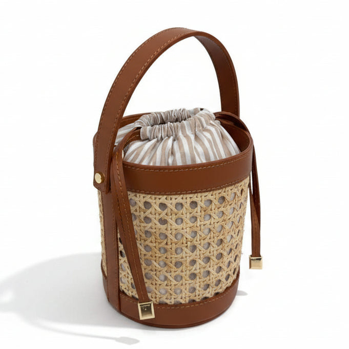 Secchiello elegante realizzato in vera pelle e rafia, perfetto per aggiungere un tocco naturale e raffinato ai tuoi look. Il design combina materiali di alta qualità con uno stile versatile, ideale sia per il giorno che per la sera.